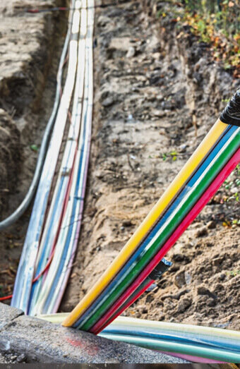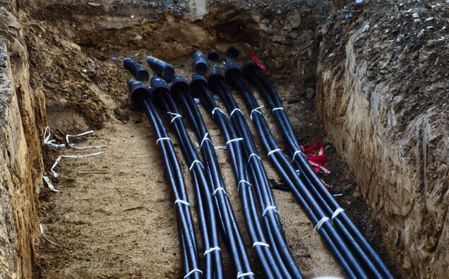 Expert installation of mains cabling from network pillars to metre boxes with correct segregation, depth compliance, and protection measures according to distributor requirements.